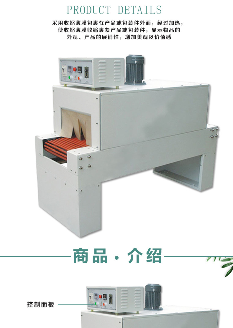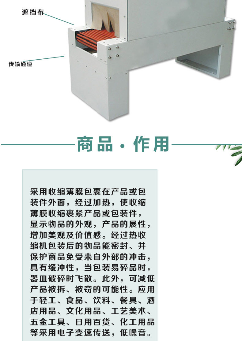 采用收缩薄膜包裹在产品或包装件外面,经过加热,使收缩薄膜收缩裹紧产品或包装件,显示物品的外观,产品的展性,增加美观及价值感。经过热收缩机包装后的物品能密封、并保护商品免受来自外部的冲击,具有缓冲性,当包装易碎品时,器皿破碎时飞散。此外,可减低产品被拆、被窃的可能性。应用于轻工、食品、饮料、餐具、酒店用品、文化用品、工艺美术、五金工具、日用百货、化工用品等采用电子变速传送,低噪音。