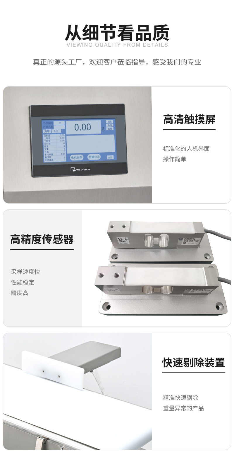 重量选别机可以嵌入流水线使用,检测包装产品重量是否存在超重、欠重、等重量偏差问题。广泛应用于袋装、盒装、灌装、箱装、瓶装等包装产品的数量或附件缺失,重量异常等情况,并自动剔除不合格产品。确保产品的净含量、数量、符合生产标准及规范要求,节省原材料成本,提高产品品质与完整性,避免客户投诉。